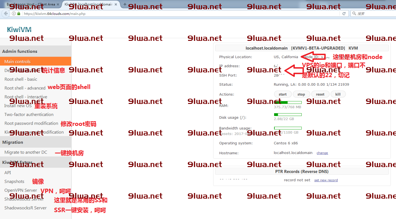 搬瓦工VPS管理用的是自主开发的系统,使用还是非常的方便,大家参照图中的解释进行管理和使用VPS即可。
